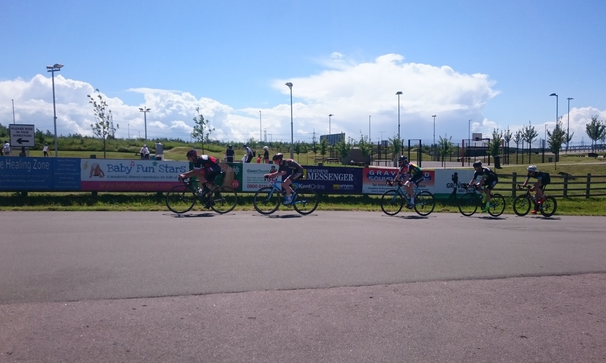 I had been out for a short ride in the daytime to test the legs, and it was very hot. The evening was a bit cooler, but still hot. I knew one of my biggest challenges would be to stay hydrated and avoid cramping, so I started the race with two full water bottles. On the warmup lap I was happy to hear someone say “Is that James Hawkins” behind me. It was Ben who I sometimes ride with in the Bigfoot level 1 group. Always nice to haveĀ a familiar face around when you’re racing. The pace was quick from the off. The first few laps I sat in the bunch, but 10 minutes in there was an attack by 2 riders. I took it upon myself to chase them down, and led the chase on the front of the bunch for a couple of fast laps. “That was stupid” I thought to myself. At the pace we were going a breakaway would never be able to make it stick, so to burn a match doing all the chasing on my own was tomfoolery! Pretty soon we had caught the E12 race, which Ben rightly pointed out was hilarious. We were also having to negotiate our way around the womens race regularly. Not sure how many times we lapped the other two races, but it was a few. Due to the speed, low light,Ā constant squeezing past other racesĀ and the heat there was a fair bit of wobbly riding going on. I took notes of who looked risky and kept an eye on them. In the last half of the race the race commissaire signalled for us to slow down, not sure why, maybe he thought we were racing too fast?! So we had a lap where everyone had a chance to recover a bit, which, with hindsight, was like trying to put out a fire by throwing petrol on it. Soon after this the lapboard showed 5 to go. 5 short laps was the equivalent of 2 or 3 full length laps, and the pace started ramping up even more. I started moving up as and when I could. I knew the last lap was going to be frantic, the first 10 into the last corner would probably be the 10 to score points. So I made sure I was in the top 10 with 2 laps to go. On the last lap I moved up a couple of places, and going into the last sweeping fast bend Ben was in front of me. As we came out of the bend I went past Ben and jumped on the wheel of someone starting their sprint early. As this happened we were passing the E12 race again, so we were bunched up on the right of the road and they were on the left. However, as the sprints started all Hell broke loose. There were 3 riders in front of me blocking my way, but I saw a gap open up to the left of the track and managed to put enough power down to get through it. Going the long way round and on the slower side of the track I started my sprint a proper. I managed to make it up to 3rd position over the standard finish line, but had forgotten about the transponders and the different start/finish line. I lost 2 positions just before crossing the line to finish in 5th. Looking back at my stats my HR was well and truly in the red at 197bpm, not sure if that’s a good thing or not!? Ben had not managed to follow through the gap with me, seems a rider in the E12 race had veered into the path ofĀ another rider in our race and caused a few people to slam the anchors on during the sprint – better luck next time Ben!